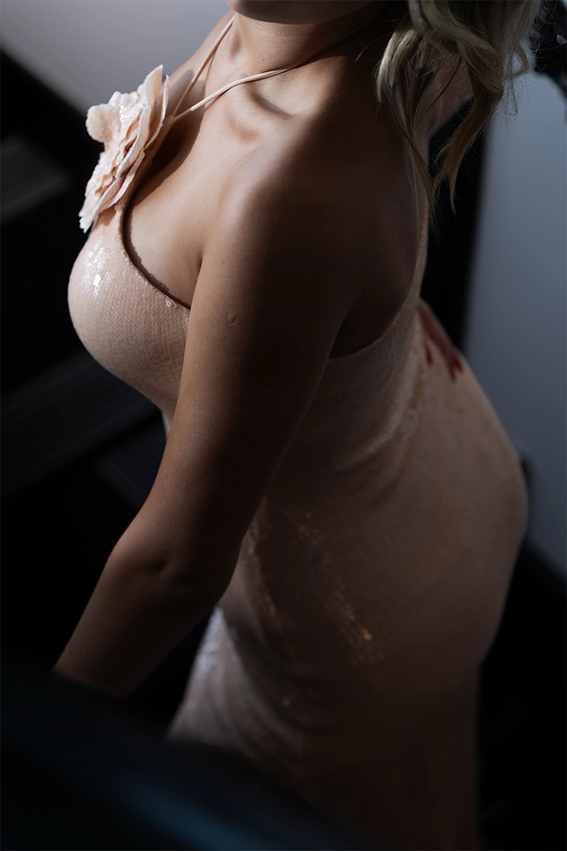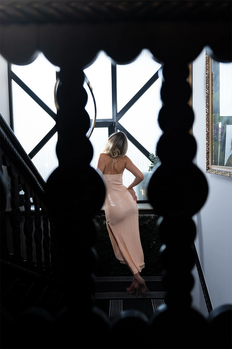 Materialul acoperit integral cu paiete prinde lumina frumos la fiecare mișcare, iar croiala mulată evidențiază silueta fără să încarce.