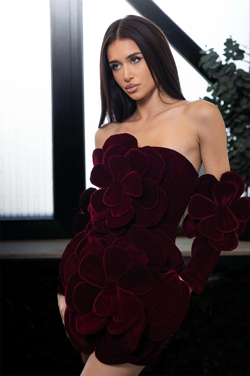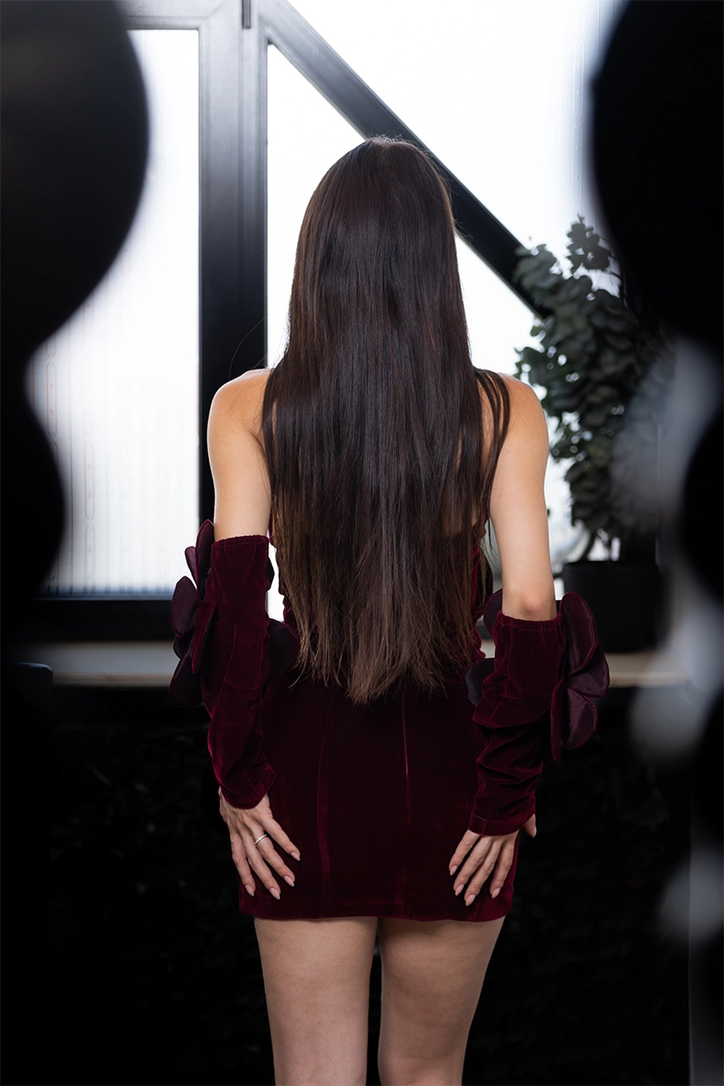 Croiul fără bretele scoate în evidență umerii și silueta, iar culoarea vișinie adaugă un plus de eleganță.